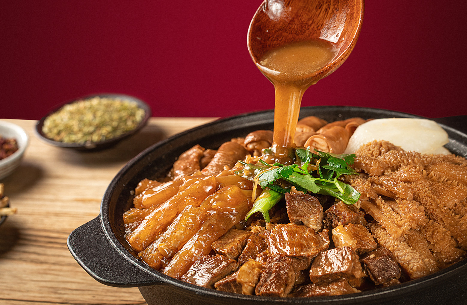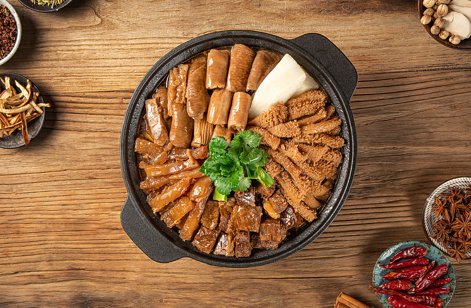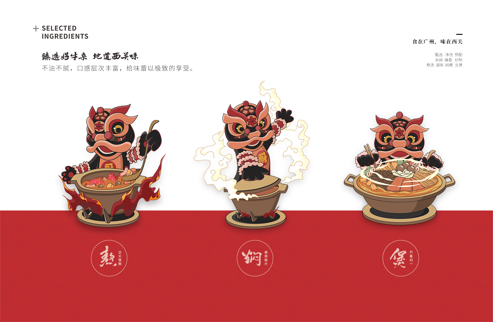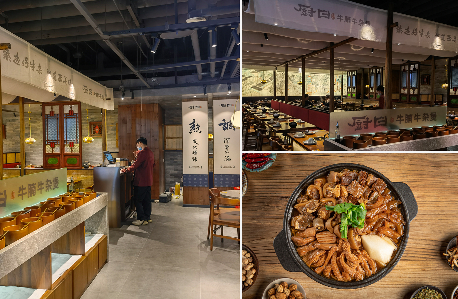 為將一道牛腩牛雜煲做到極致,廚曰精選優(yōu)質(zhì)上等牛雜,從100公斤牛雜中,只清理出10公斤上等牛雜原料,經(jīng)過甄選、凈洗、預(yù)配、 汆焯、煸香、炒制、熬湯、調(diào)味、燜煮、文煲等多道工藝,加入精心秘制的醬汁,及十多味中草藥材配備牛骨熬出的高湯底料,既美味又養(yǎng)生。文火慢燉的烹調(diào)方式,使食材充分入味,讓整個(gè)煲吃起來,不油不膩,口感層次豐富,給味蕾以極致的享受。
