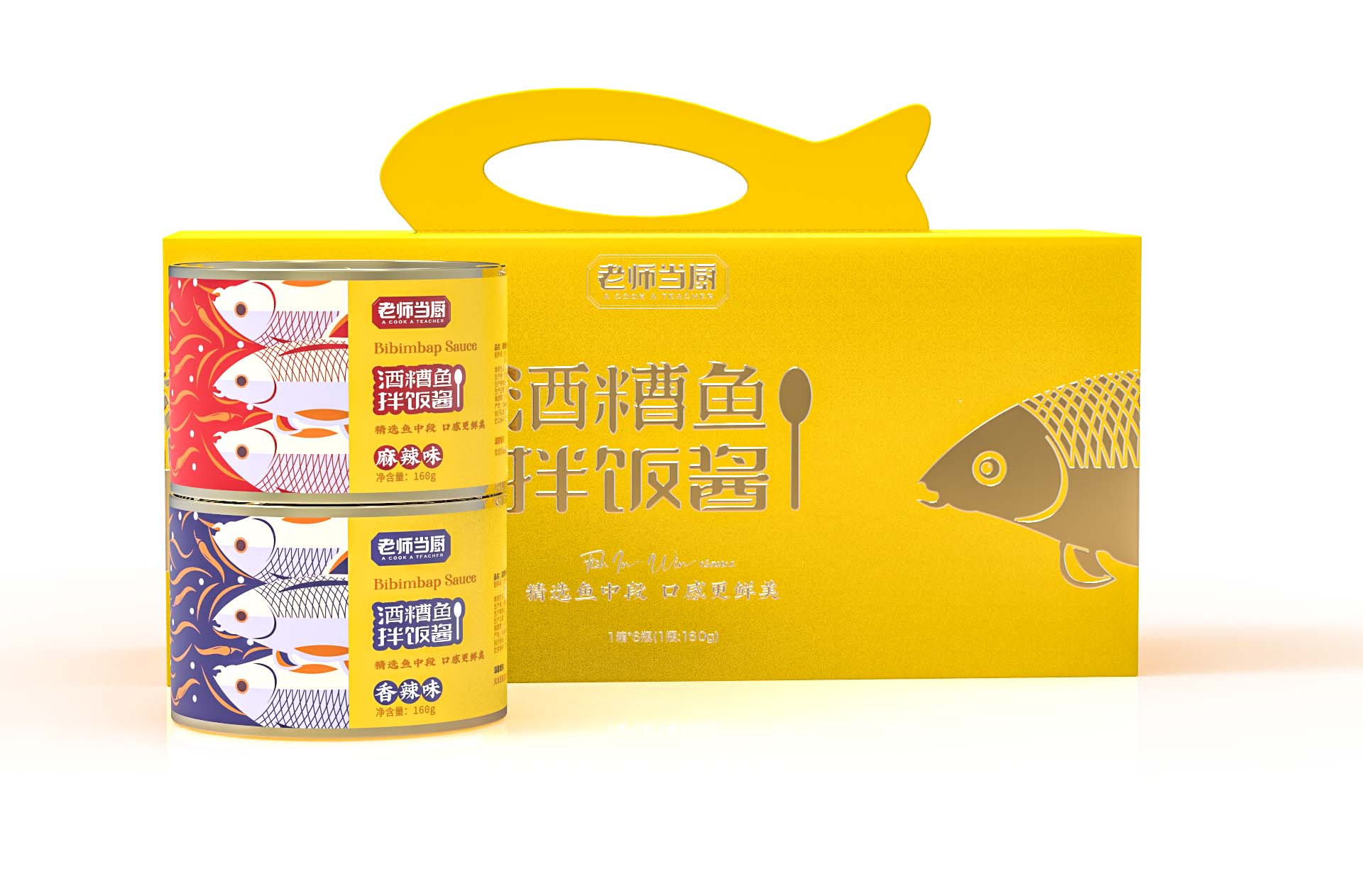 禮品級(jí)的酒槽魚包裝, 魚的創(chuàng)意元素應(yīng)用在包裝外盒上和內(nèi)盒上迎合中高端市場(chǎng),色調(diào)以黃色和暖和系為主,畫面采取原創(chuàng)圖案設(shè)計(jì),居中對(duì)稱性構(gòu)圖,作品已上市,銷售地區(qū)安化市主推,以當(dāng)?shù)匚锂a(chǎn)性銷售。定位中高端,相對(duì)同級(jí)產(chǎn)品,撥高了產(chǎn)品檔次與形象。